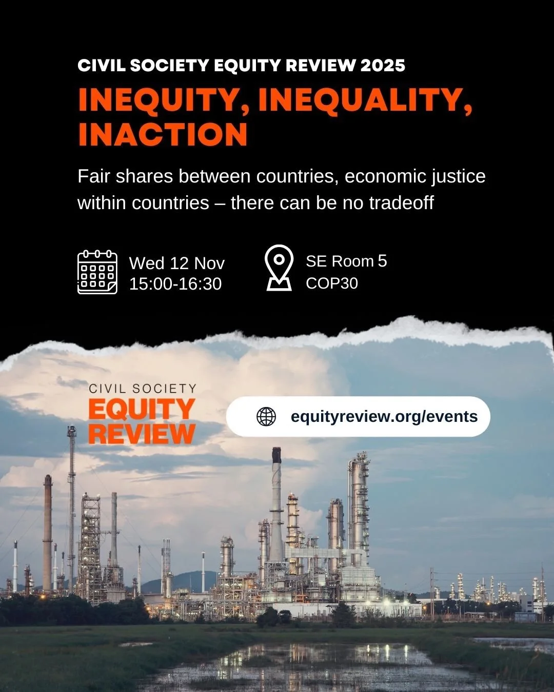 Join our report launch to hear more about the 2025 Civil Society Equity Review, entitled “Inequity, Inequality, Inaction – A Civil Society Equity Review of the post-Paris climate regime and the new NDCs, with a focus on mitigation, the role of climate finance, and equity and fair shares across and within countries."